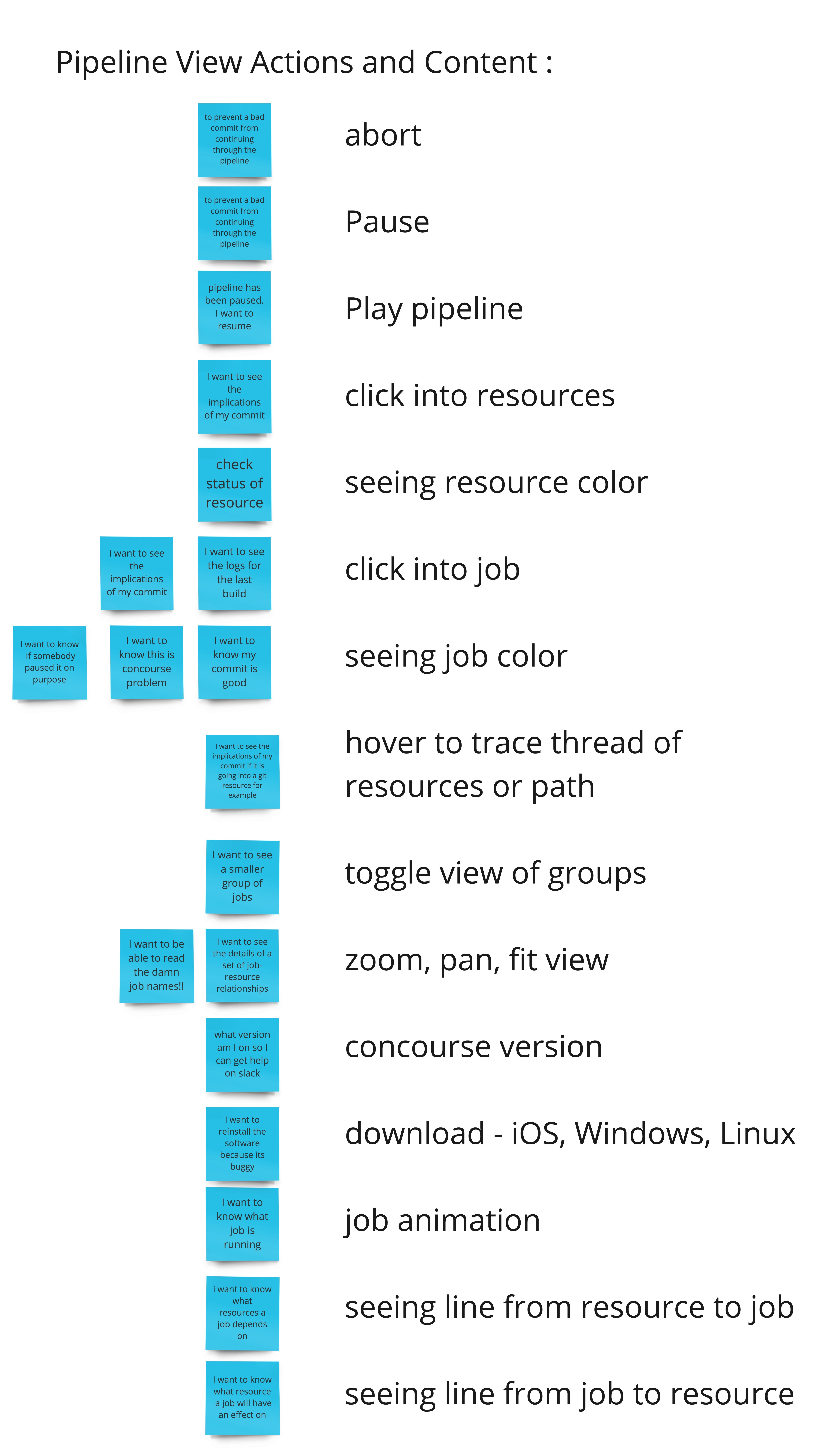My design pair, Sam Peinado, and I did a dump of post-its in Realtimeboard to list out all of the actions and content that exists today on the pipeline page and what content those actions mapped to.