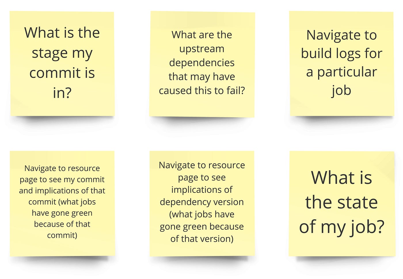 - As an App Developer, I am watching my commit go through the pipeline. I am waiting for the pipeline to be green so that I know my commit was successful. If it goes red at any point, I want to know if it was my code that broke the pipeline.