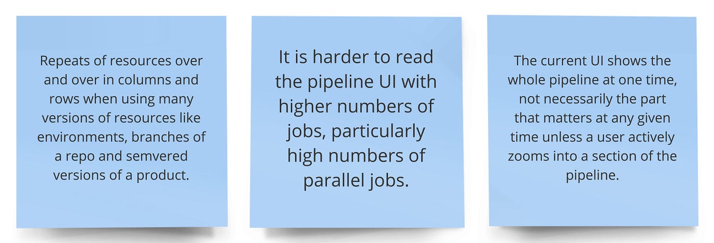 Adding this feature into the current anatomy of Concourse is a breaking change to the existing pipeline visualization. Resources themselves are not very legible in the current visualization; and we layer on additional information such as the spaces that are being used and the resulting job combinations that are automatically generated. So, how do we go about increasing the complexity of the visualization while making the smallest incremental change to test the new design?