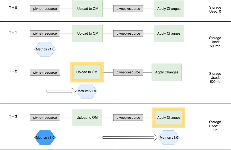 t=1a new version of the “Metrics” product is released on PivNet, picked up by Concourse, downloaded and begins to flow through your pipeline - At