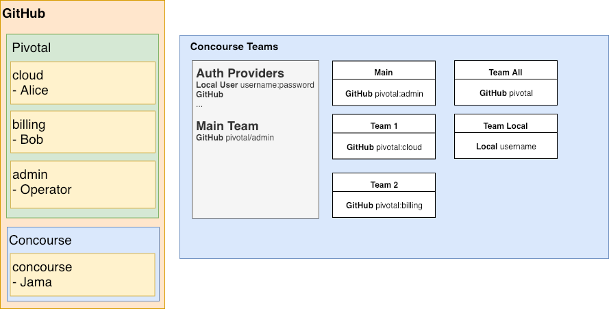 On the left we have two simple GitHub orgs: Pivotal and Concourse. Pivotal has three teams: cloud, billing and admin. Concourse has one team. Each team has a single user attached to them.