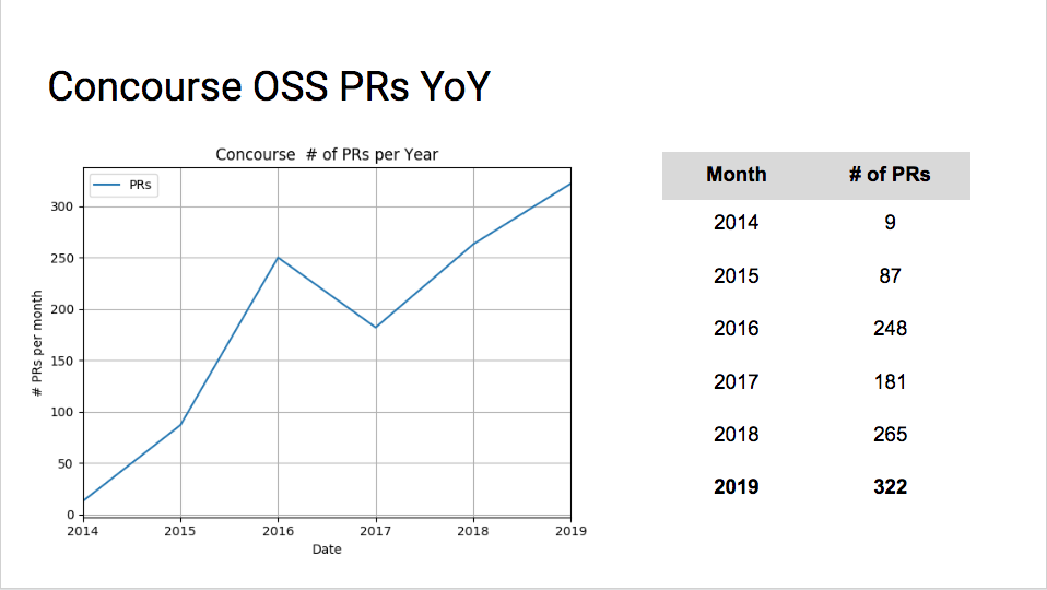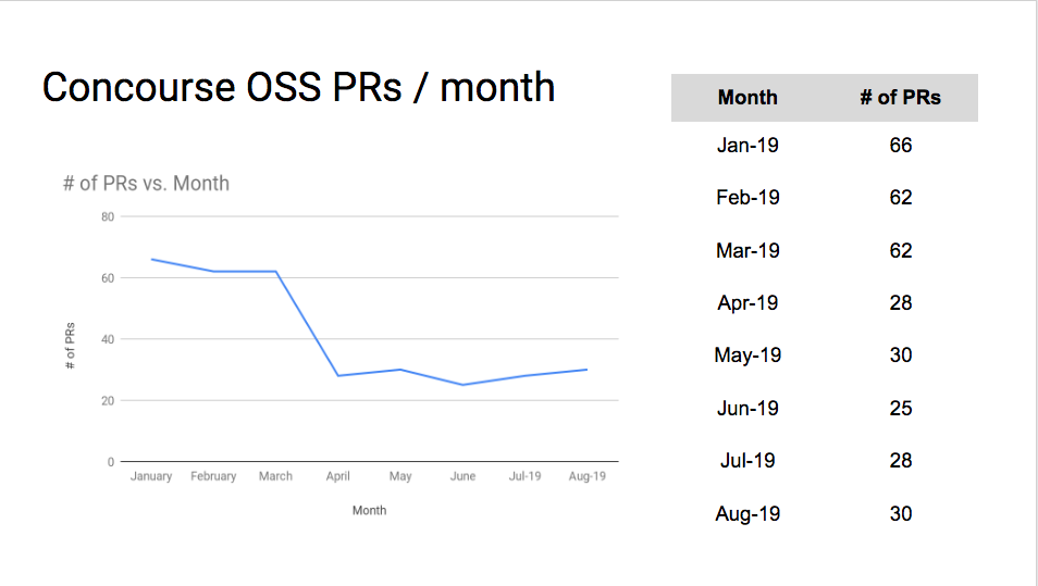 As some of you may know, the Concourse team switched over to a PR-based workflow at the beginning of the year. This change is in line with our objectives of being open and transparent with our community of contributors. Plus, its just good thing to do because that's what most OSS projects do. Since then we've noticed a noticeable uptick in PRs opened by non-Concourse core contributors across our repos: