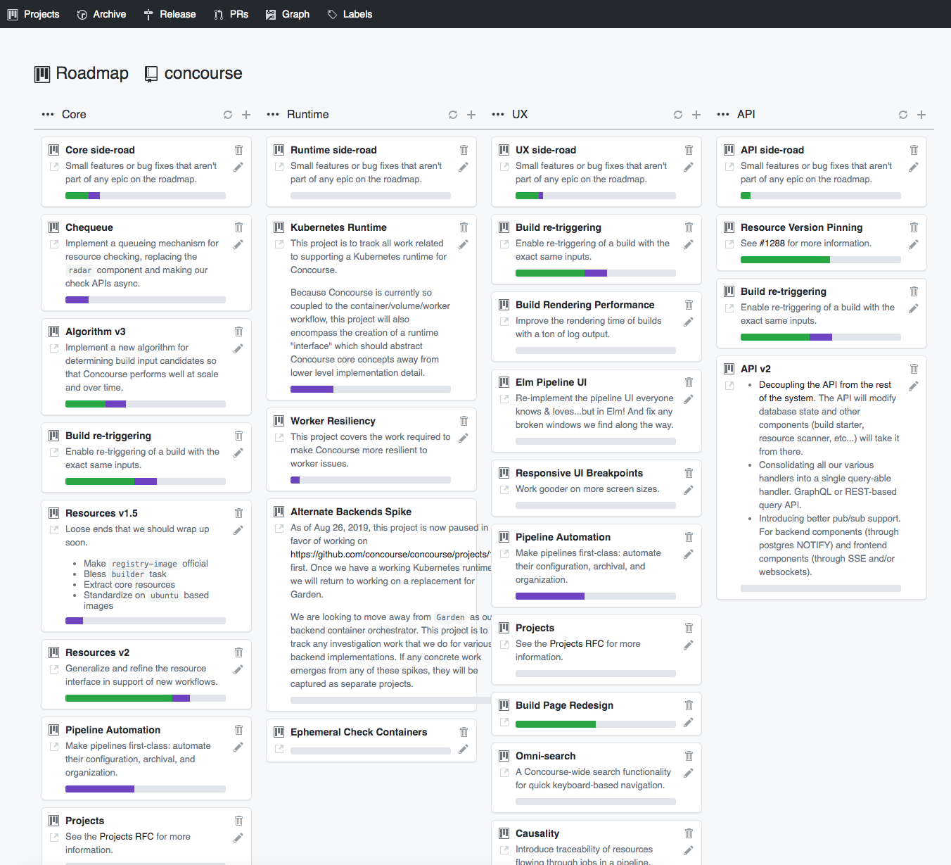 There's been some big changes to how we organize and visualize each track of work now. If you take a peek in the project board https://project.concourse-ci.org you'll see now that each of our tracks are clearly labeled as swimlanes, with each prioritized Epic as cards under each swimlane. We hope you'll find this new format easier to consume