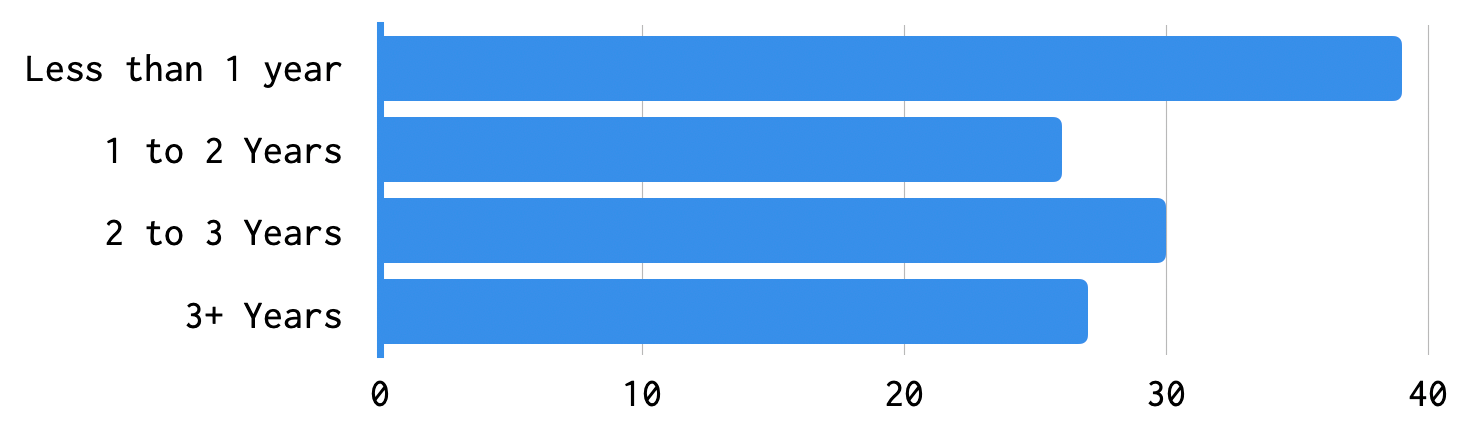 Most of the people who responded indicated they had been using Concourse for one year or less. It's great to see that more people are picking up and experimenting with Concourse with each new release, and it's just as exciting to see that people stick around: more than 45% of respondents said they have been using Concourse for 2+ years. Whenever we interpret feedback from the community, we want to make sure we're taking into account the experiences of both newcomers, established users, and very experienced power users. Each segment experiences different challenges, and prioritizes different parts of the product.