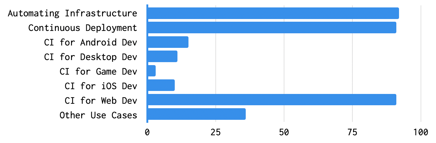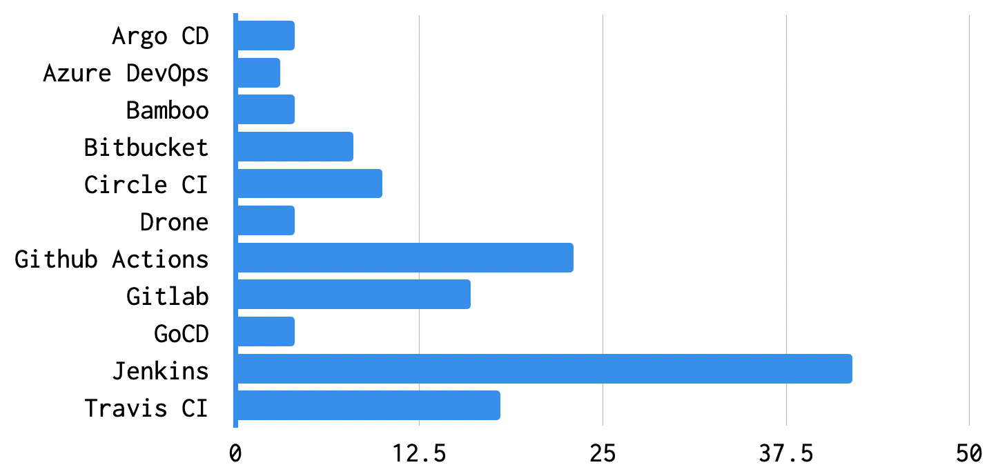 Another dimension that's helpful to understand is the related experiences that each survey respondent is equipped with. When looking at other CI/CD tools that our community employs, Jenkins is still the top dog, accounting for nearly 30% of the tools mentioned. GitHub Actions has seen a rise in adoption since its initial release, and Travis, Gitlab, Bitbucket, and CircleCI are all fairly common options as well.