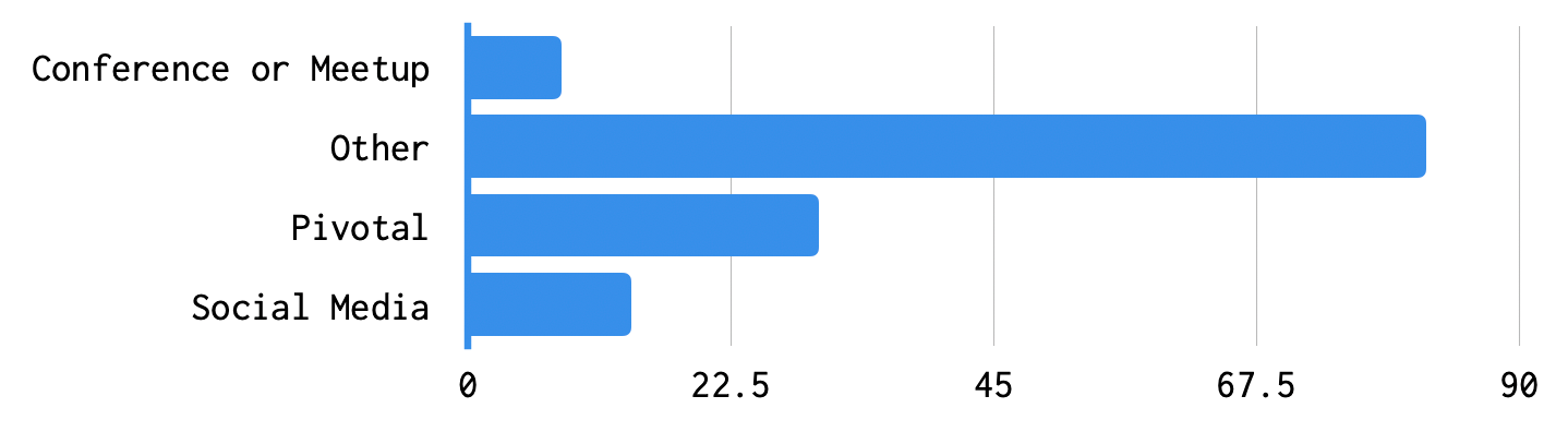 Pivotal Software (now VMware) has been Concourse's largest supporter since the project's inception. In previous years, it was common to see more than half of respondents say they were introduced to Concourse CI through a Pivotal Labs engagement, or through Concourse’s role in automation of the Pivotal Platform, Pivotal Cloud Foundry. Now the community has started to branch out, with only 22% of people reporting that they learned about the product through Pivotal.