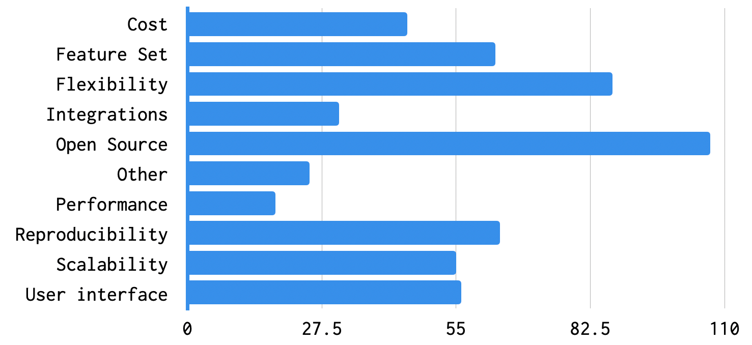 When asked about the very important why behind their Concourse usage, concerns about Open Source tooling and flexibility were top of mind. The special emphasis that Concourse put on reproducibility and user interface also ranked highly, along with Concourse's scalability and overall feature set. Scalability is always a huge concern for the team, as we see enterprise customers frequently testing the limits of their tooling (sometimes with hundreds of Concourse clusters, many thousands of teams, and many hundreds of thousands of pipelines). Likewise, reproducibility is a commitment we're not planning on straying from any time soon.
