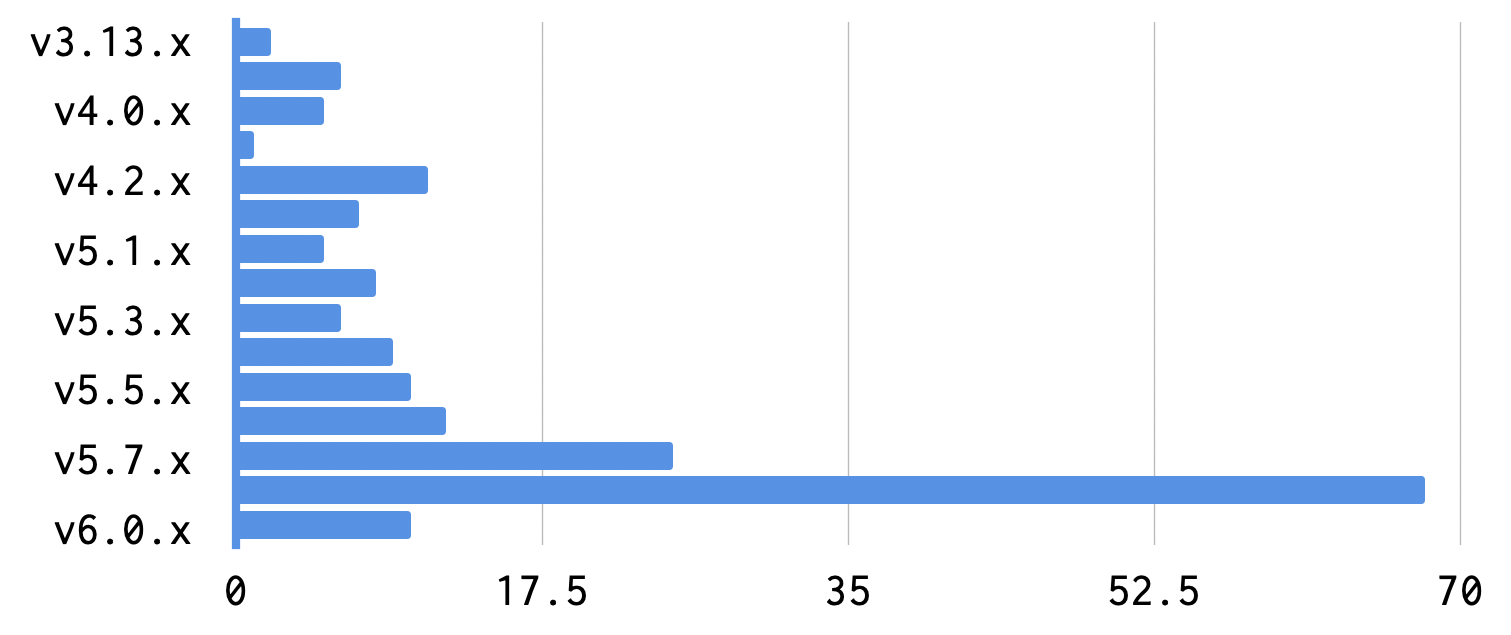We released the survey just as v6.0.0 of Concourse was being finalized, so it was only close to the end that we started to see people upgrading to v6. We're thrilled, nonetheless, to see so many people had already upgraded to v5.8.x. Together, versions v5.8.x and v5.7.x represented the majority of survey respondents, with a low (>10) rate of responses for any other version.