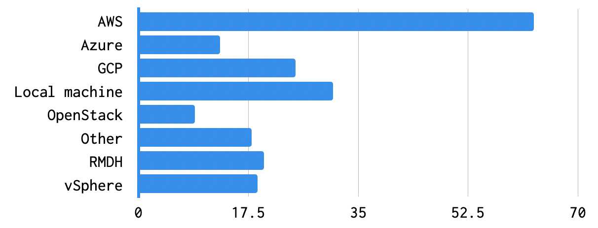 Finally, when asked about their preferred IAAS, AWS takes the top position again for the third year in a row. We consistently see a strong vSphere presence from enterprise customers, but it's really interesting to see the variety of setups that the open source community as a whole employs when deploying Concourse.