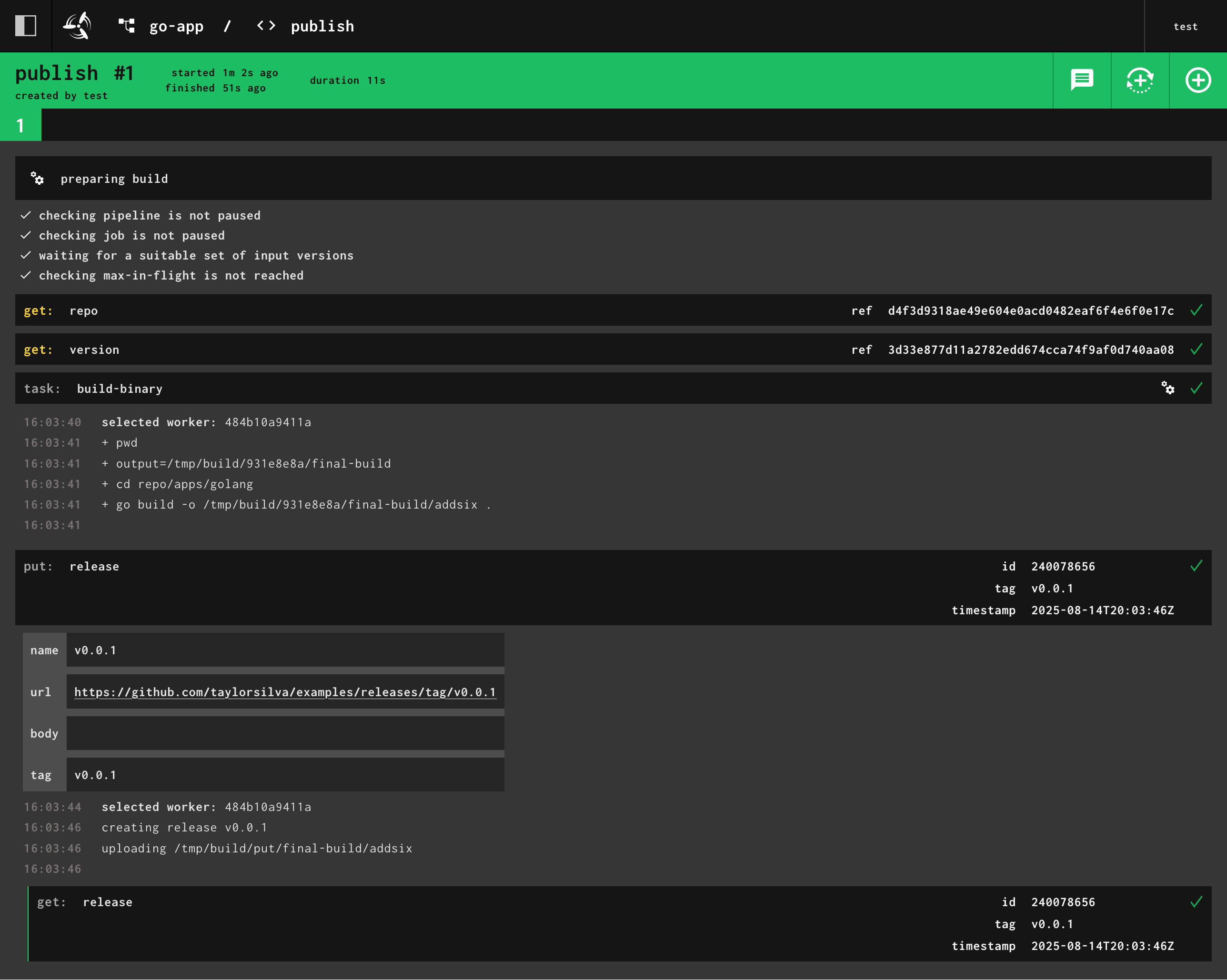 That's the whole pipeline! Congratulations on testing, building, and publishing a silly little Go app with a Concourse pipeline 🎉