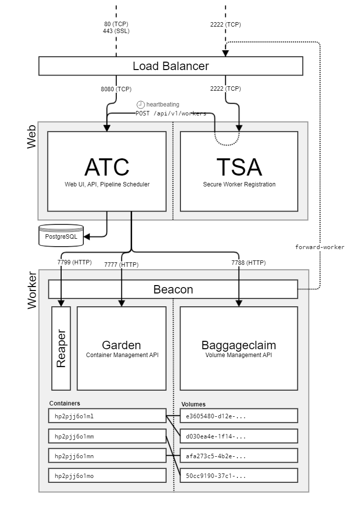 Workers are machines running Garden and Baggageclaim servers and registering themselves via the TSA.